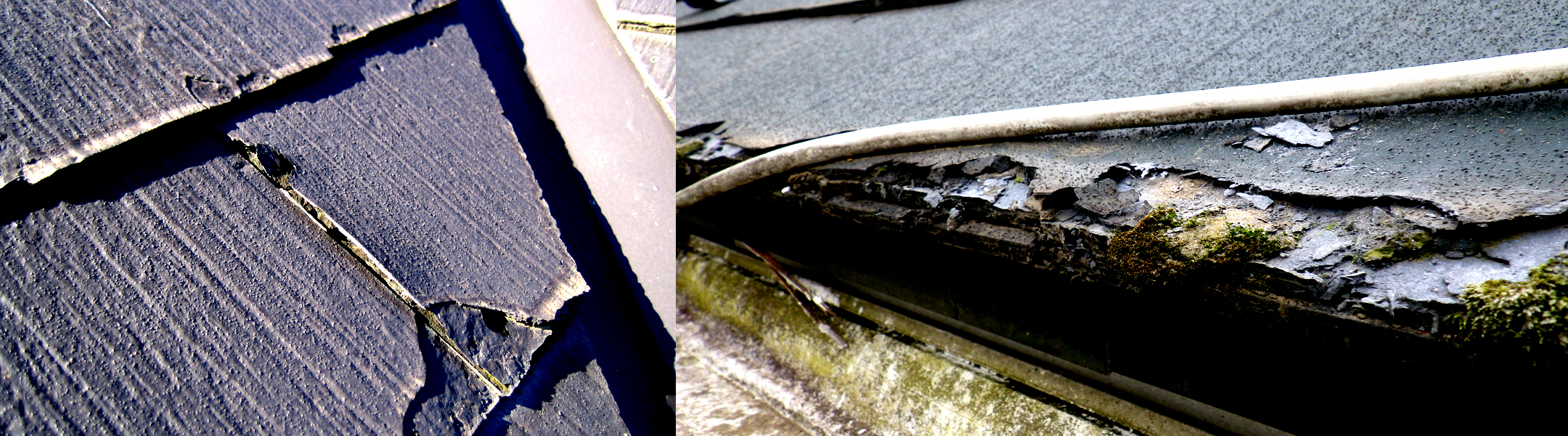 スレート屋根は、太陽光が多く当たる面では色あせが進み、影になる時間が多い面では苔等が繁殖しやすく、一軒のお家でも面によって違う劣化を起こします。 スレート自体の防水性が無くなり、水分を吸収しすぎると、剥離する可能性がどんどん増えていきます。塗装工事を行って延命してあげましょう。