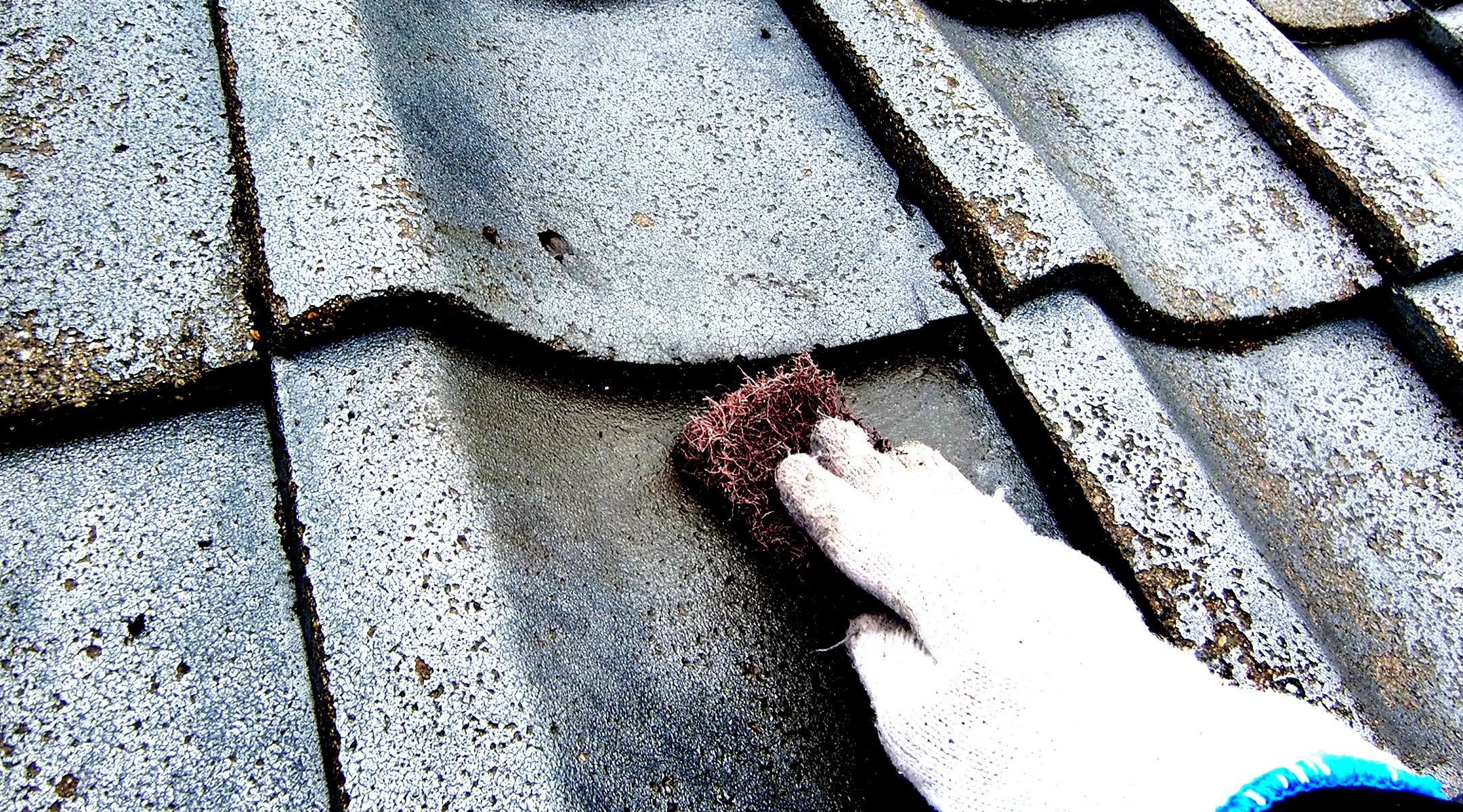 下地の状態や仕様によっては水洗いを避け、マジックロン等を使用してケレンします。苔や汚れを出来る限り取り除いてから塗装を行います。