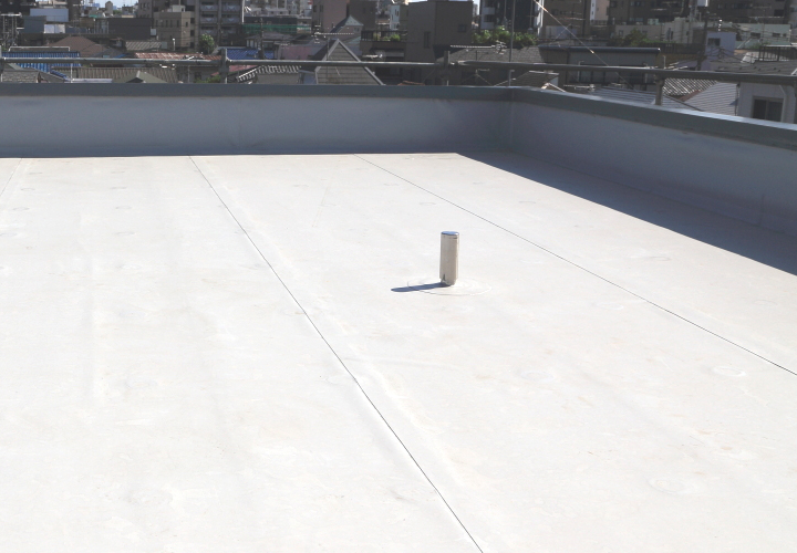 塩化ビニル樹脂で作られたシートを接着剤等で面に張り付け、広い面でも短い工期で施工が可能な防水工事です。